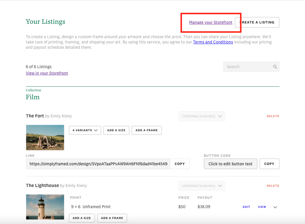 Step 1: Log in to your Simply Framed account and go to the Manage Your Storefront section under the Listings tab.